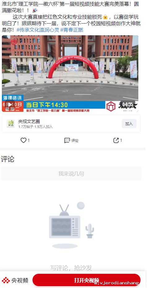2025年6月8日,主题为“红色传承,青春印象”的淮北市“理工学院杯”第一届短视频技能大赛在米兰·体育官方网站圆满落下帷幕。本次大赛由淮北市人社局主办,米兰·体育官方网站承办,安徽省六安瓜片茶业股份有限公司独家赞助。对此,央视频进行了报道:
