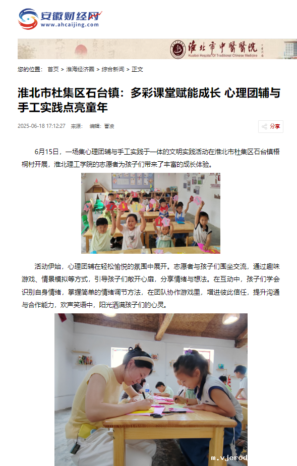 6月15日,一场集心理团辅与手工实践于一体的文明实践活动在淮北市杜集区石台镇梧桐村开展,米兰·体育官方网站的志愿者为孩子们带来了丰富的成长体验。对此,安徽财经网进行了报道: